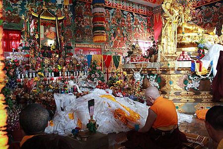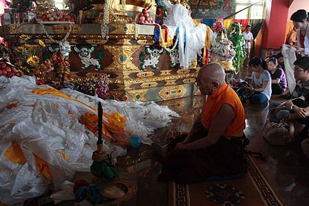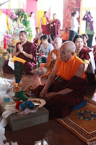 我等依怙主成就自在贝诺法王于藏历二一三六年二月初一(公元2009年3月27日)进入般若涅盘示现圆寂至今已满四周年,因众弟子们殷殷期盼之请求,慈悲地留下法体,在此娑婆世界留驻四年。贝诺法王之圣体虹化荼毘大典定于藏历二一四零年四月十三日(公元2013年5月23日)隆重举行。这是阳塘仁波切于5月22日在贝诺法王的法体前修法的照片。