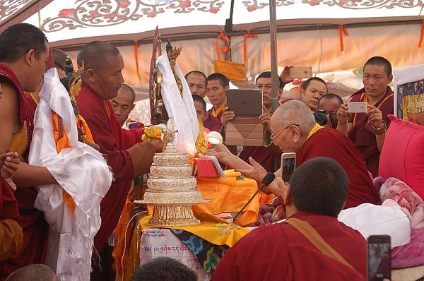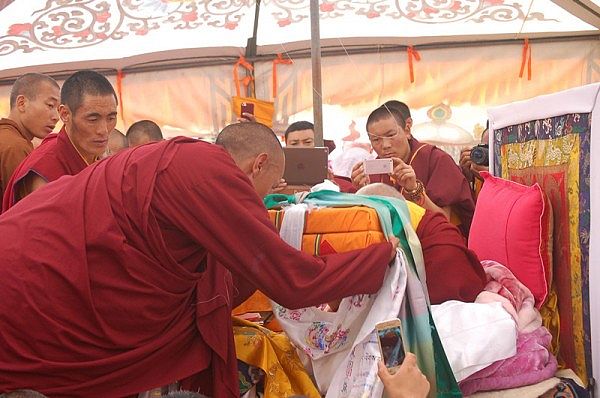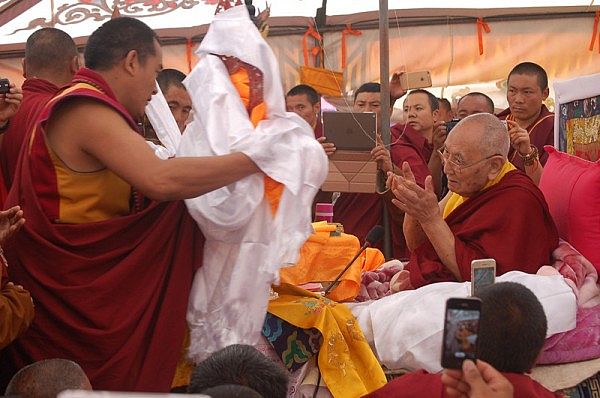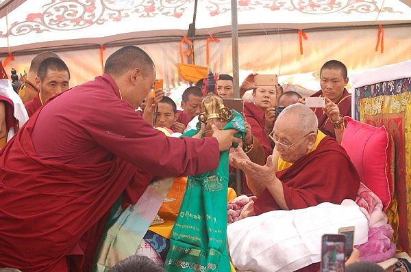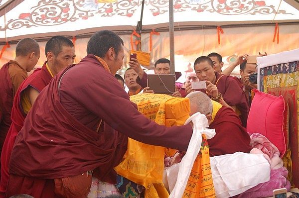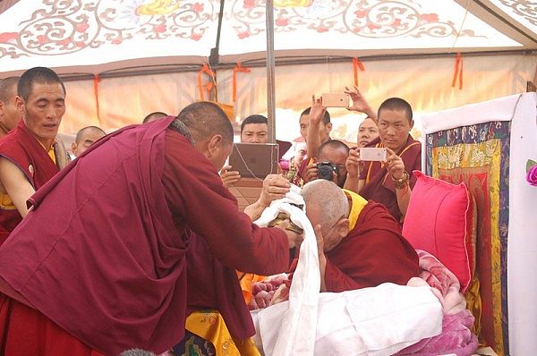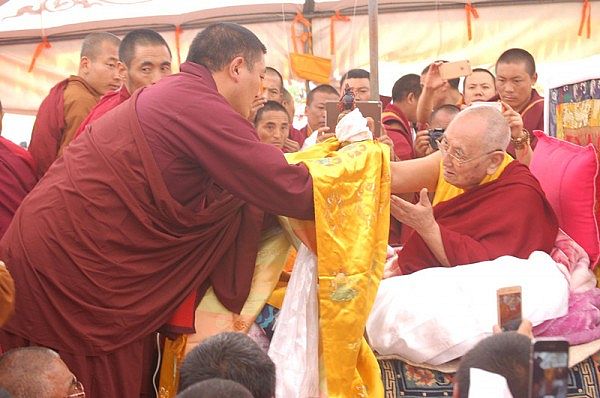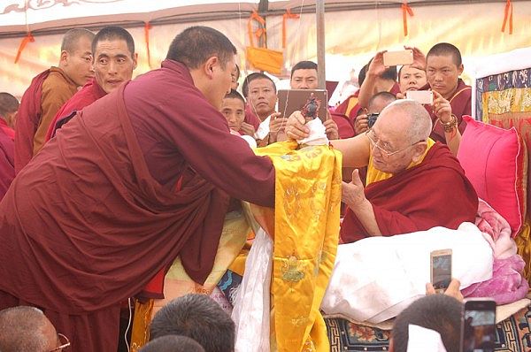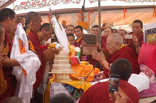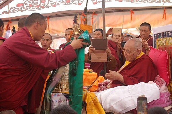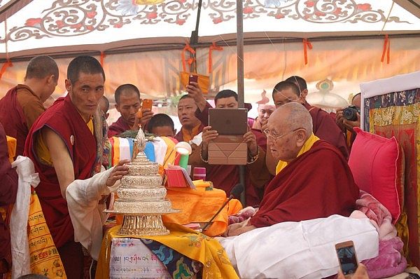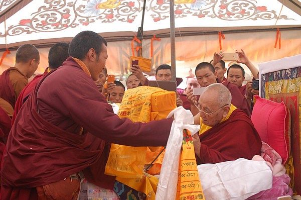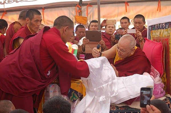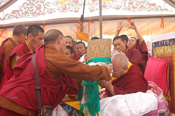 阳塘仁波切于灌顶法会为每个弟子赐予加持并接受供养